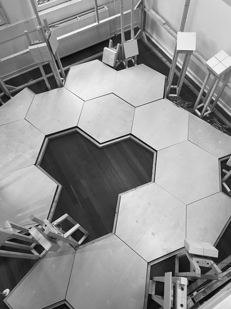 VibroRaised-Relief: Wooden Floor Tiles: Fundamental to architectural space, the flooris designed for participants to experience sound spatialization. Each floor tile incorporates four speakers, creating a dynamic “sound landscape.” Different vibrations transmit through the body as individuals traverse different areas, simultaneously enabling spatial storytelling and complex sensations from multiple sources.