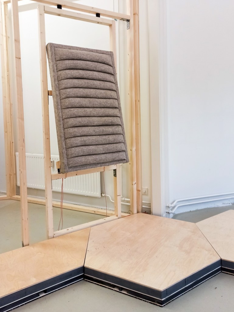 The installation is an arrangement of haptic surfaces such as vibrating floor boards and soft surfaces on which the visitor can lean, sit or lay-down, to experience sound through the sense of touch.